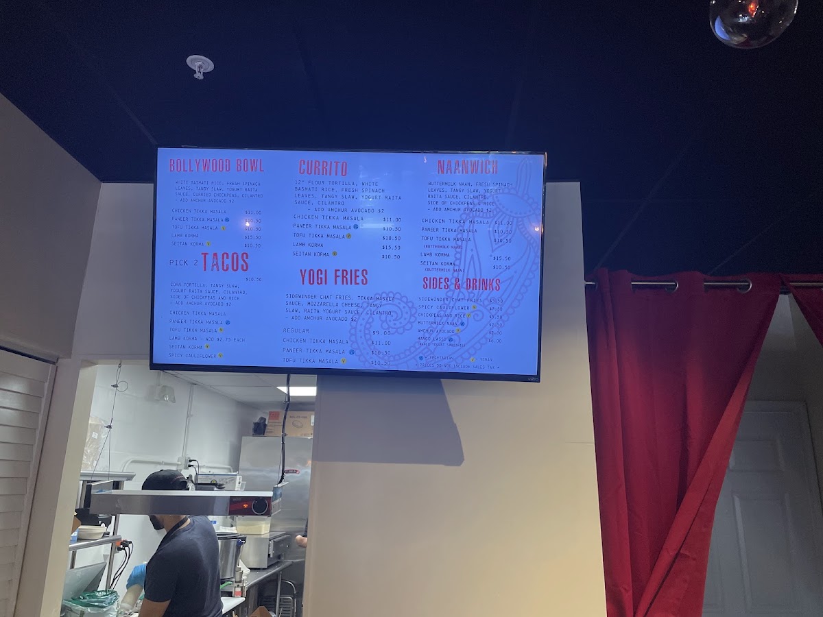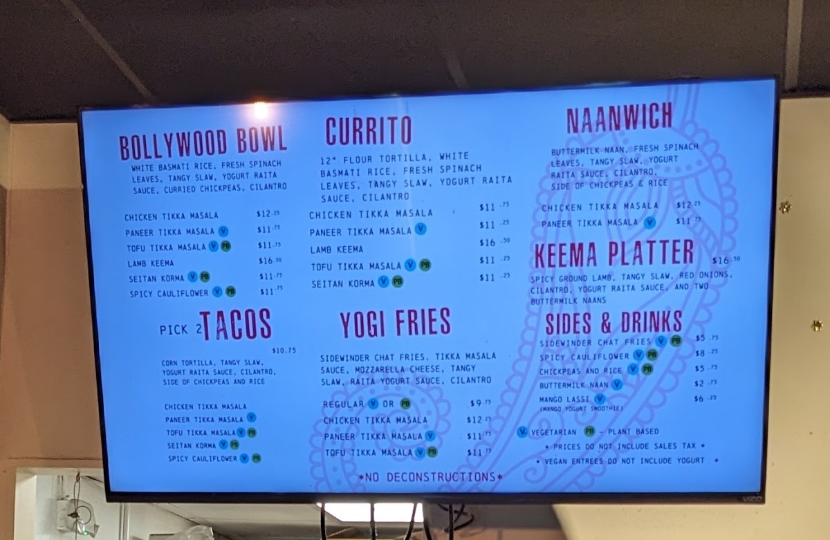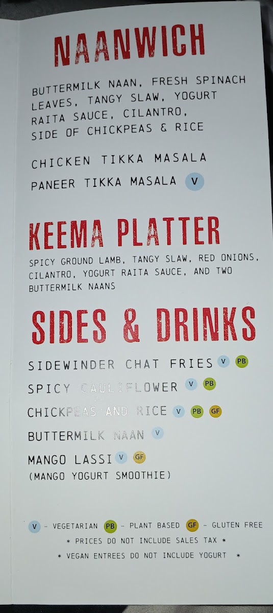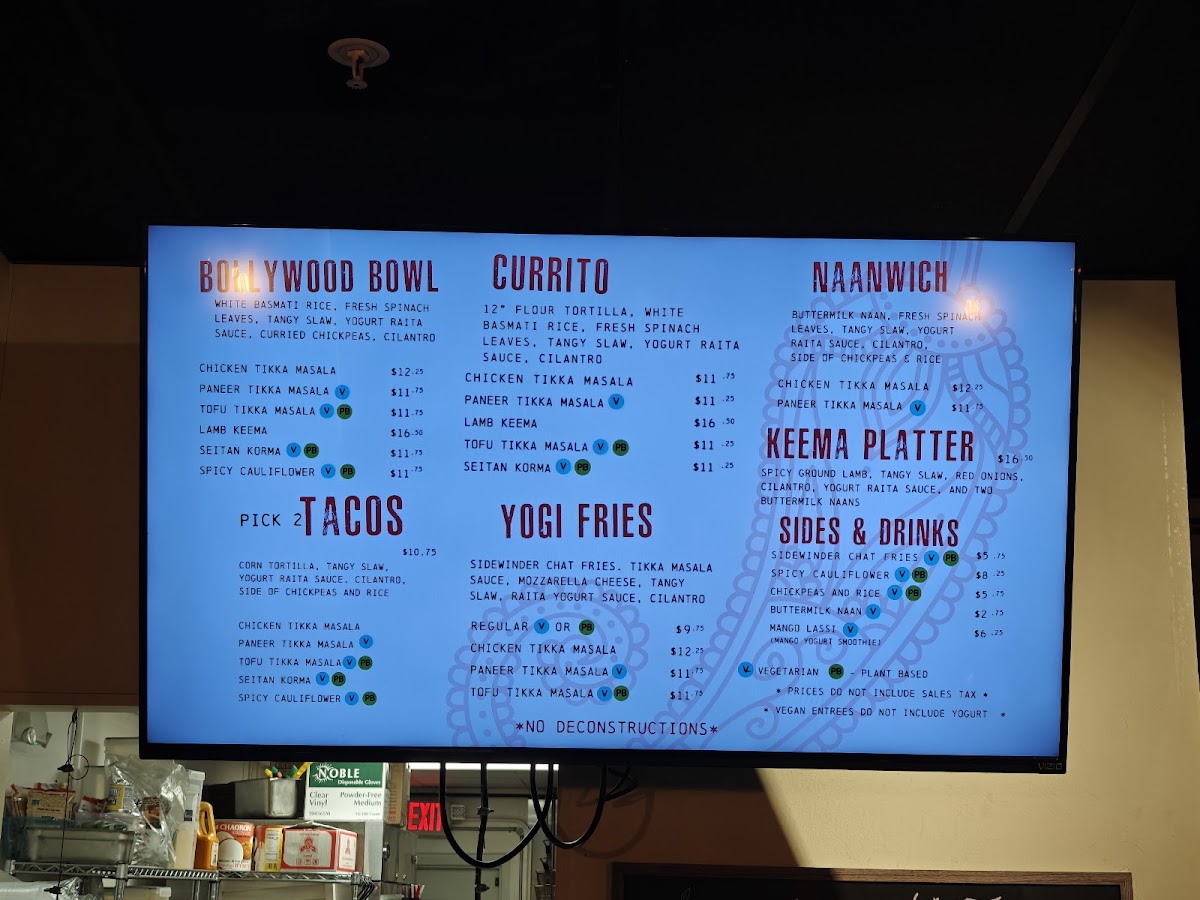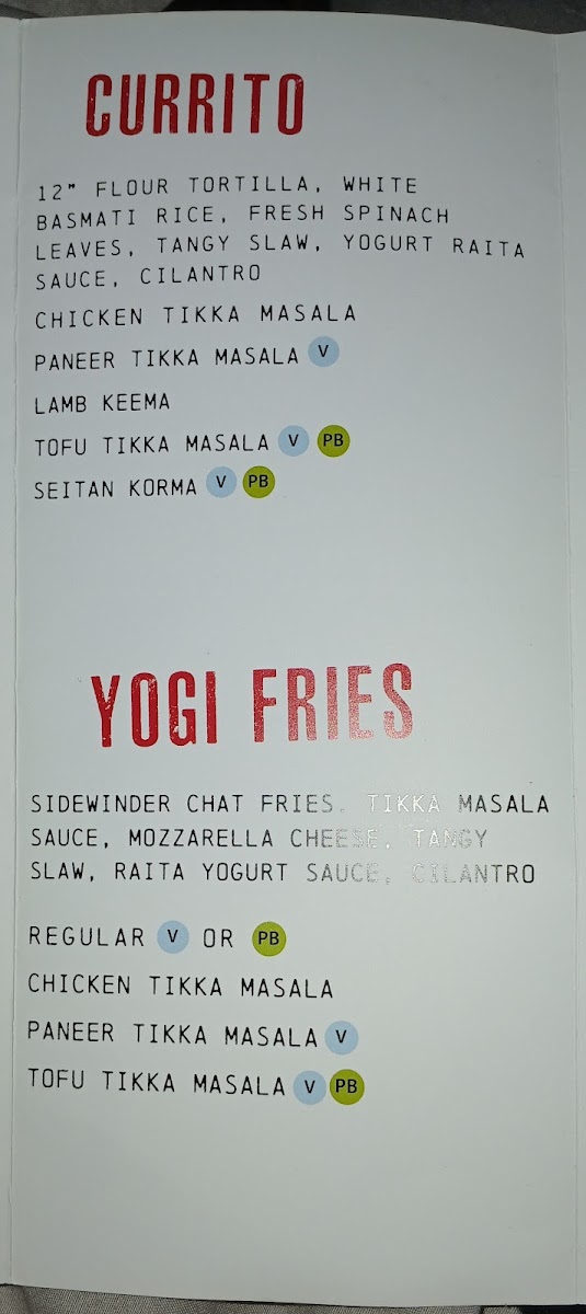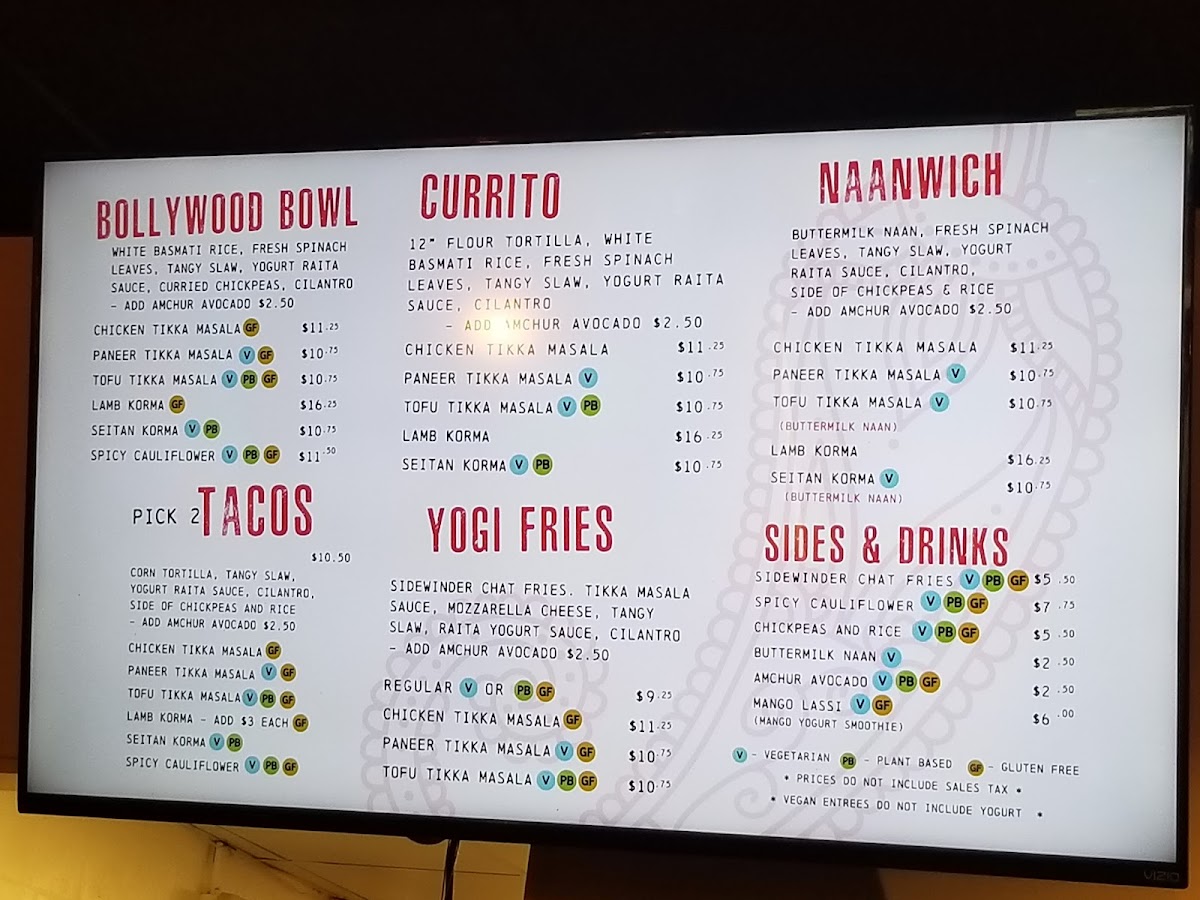 Taco options: chicken tikka masala (gluten-free), paneer tikka masala (vegetarian, gluten-free), tofu tikka masala (vegan, plant-based), seitan korma (vegan, plant-based), spicy cauliflower (vegan, plant-based)